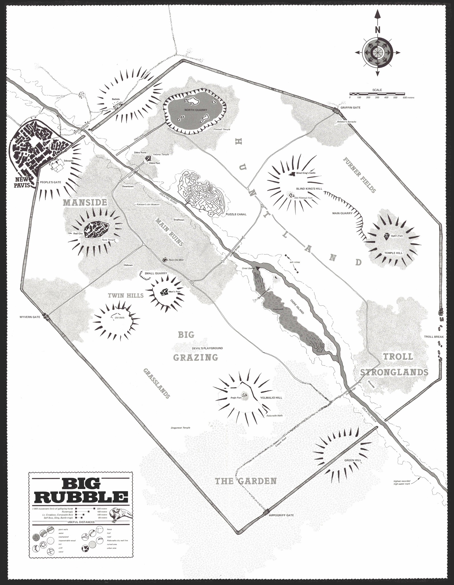 The Rubble, or the Big Rubble is one of the great wonders of Glorantha. What can be seen now - the mighty 25m high walls and the ruins within - are the remains of the city founded by Pavis during the era of the Empire of the Wyrms' Friends. Pavis was a hero (at the time, now a demi-god) who was originally born in Adari around the year 800. Arriving in Dragon Pass as a refugee after Adari was sacked by trolls and giants, he learned great magic, and used it to animate the Faceless Status that sat upon the Empty Throne in Shadows Dance. Riding this status with his followers, we defeated Paragua and his giants that at the time occupied the site that would become Pavis, then the ruins of a God-Learner city called Robcradle.